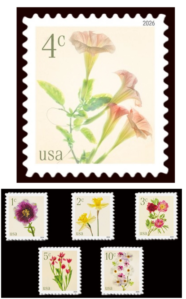 Stamp: 4c Trumpet Flowers - Sheet of 20, and Coil of 10,000 (Part of the Series of low denominated flower shown at right.)